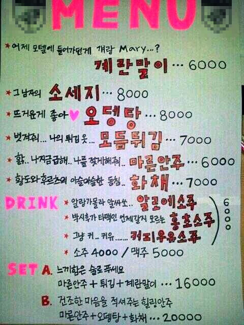 [아시아경제 온라인이슈팀] 너무 야한 대학주점 메뉴판이 네티즌 사이에 화제다.최근 여러 온라인 커뮤니티와 트위터에는 '흔한 대학축제 주점 메뉴', '화끈한 대학축제 메뉴' 등의 제목을 단 게시물이 전파되고 있다. 이 게시물에는 성북구에 위치한 모 대학에서 축제기간 학내 주점에서 제공했던 메뉴판 사진이 담겨있다.이 메뉴판에는 '뜨거운 게 좋아 오뎅탕', '벗겨줘 나의 튀김옷 모듬튀김', '어제 모텔에 들어가던게 걔랑 Mary? 계란말이' 등 낯뜨거운 수사를 곁들인 안주 이름이 기재돼 있다. '박시후가 타먹인 언제갈지 모르는 홍초소주', '그냥 커…커유 커피우유소주' 등 자칫하면 성적 비하로 비쳐질 수 있는 제목도 다수 눈에 띈다. 네티즌은 "요즘 아무리 섹드립(성적 의미를 내포한 농담)이 대세라지만 대학주점 메뉴가 너무 저질스럽다", "혈기왕성한 젊은이들인건 알겠는데 좀 자제해라", "일류 대학인줄 알았는데 영 수준이 낮다" 등 낯뜨거운 메뉴판에 유감을 표시했다.온라인이슈팀 <ⓒ세계를 보는 창 경제를 보는 눈, 아시아경제(www.asiae.co.kr) 무단전재 배포금지>
