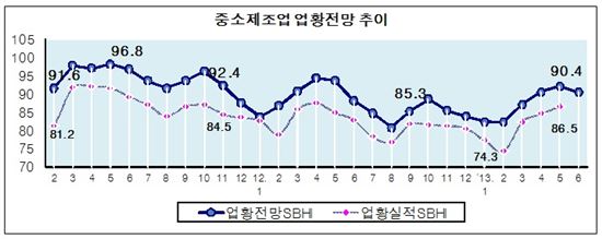 [아시아경제 이은정 기자] 중소기업 경기전망 지수가 4개월만에 하락세로 돌아섰다.중소기업중앙회는 중소 제조업체 1429개 기업에 경기전망을 설문 조사한 결과 6월 업황전망건강도지수(SBHI)가 전월보다 1.8포인트 하락한 90.4를 기록했다고 30일 밝혔다. 3~5월 3개월 연속 증가했지만 6월에 하락세로 전환한 것이다. SBHI응답내용을 5점 척도로 세분화하고 각 빈도에 가중치를 곱해 산출한 지수로, 100 이상이면 다음 달 경기가 좋아질 것으로 전망한 업체가 그렇지 않을 것으로 보는 업체보다 많다는 의미이며 100 미만이면 그 반대다.중기중앙회는 "내수부진 장기화와 세계경제의 회복지연 등 경기둔화 우려의 심리가 중소기업에 반영되면서 체감경기가 꺾였다"고 분석했다. 공업부문별로 보면 경공업(90.2→88.0)은 전월대비 2.2p, 중화학공업(94.1→92.5)은 1.6p 각각 하락했다. 기업규모별로 소기업(90.5→89.5)은 전월대비 1.0p, 중기업(96.6→92.7)은 3.9p가 각각 떨어졌고 기업유형별로 일반제조업(91.5→89.6)은 전월대비 1.9p, 혁신형제조업(94.5→92.9)은 각각 1.6p 줄었다.업종별로는 섬유제품(90.4→78.5), 가구(86.7→76.7) 등 15개 업종에서 하락세를 보였다. 반면 가죽가방 및 신발(87.3→94.3), 금속가공제품(90.9→94.1) 등 6개 업종은 상승했고 종이 및 종이제품(90.7→90.7)은 전월과 동일했다.한편 5월 중소제조업 업황실적지수는 전월(84.6)대비 1.9p 상승한 86.5를 기록했다. 5월 중소기업 관계자가 최대 경영 애로점으로 꼽은 것은 내수부진(60.3%)으로 지난달에 이어 13개월 연속으로 가장 높은 응답비율을 기록했다. 이은정 기자 mybang21@<ⓒ세계를 보는 창 경제를 보는 눈, 아시아경제(www.asiae.co.kr) 무단전재 배포금지>