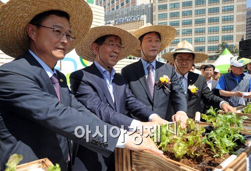[아시아경제 백소아 기자] 박원순 서울시장(왼쪽부터 두번째)이 30일 서울 중구 서울광장에서 열린 '제2회 서울도시농업 박람회 개회식'에서 직접 모종을 심고 있다.백소아 기자 sharp2046@<ⓒ세계를 보는 창 경제를 보는 눈, 아시아경제(www.asiae.co.kr) 무단전재 배포금지>
