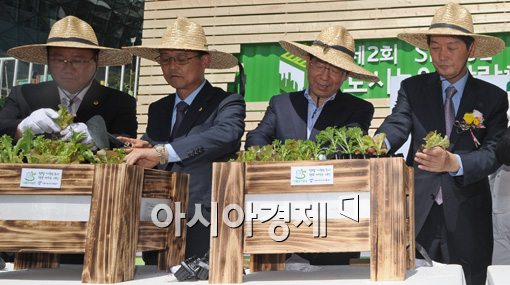 [아시아경제 백소아 기자] 박원순 서울시장(왼쪽부터 세번째)이 30일 서울 중구 서울광장에서 열린 '제2회 서울도시농업 박람회 개회식'에서 직접 모종을 심고 있다.백소아 기자 sharp2046@<ⓒ세계를 보는 창 경제를 보는 눈, 아시아경제(www.asiae.co.kr) 무단전재 배포금지>