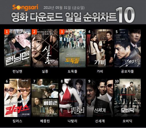 [아시아경제 진주희 기자]영화 다운로드 전문 웹하드 ‘송사리’에서 ‘신하균’ 주연의 ‘런닝맨’이 이틀 연속 다운로드 순위 1위를 기록하였다. 영화 ‘런닝맨’은 살인 누명을 쓴채 경찰, 국정원, 언론, 테러단 등의 추적을 받는 아빠(신하균)와 아들(이민호)간의 애정을 그린 영화다.20세기 폭스가 선택한 첫 한국영화로서 헐리우드 메이저영화사가 메인투자사로 참여한 첫번째 한국영화라는 점에서 매우 화제를 모으며 새로운 가능성을 보여준 작품이다.2위는 ‘문성근’ ‘추자연’ 주연의 ‘실종’이 차지하였으며, 3위는 ‘전지현’ ‘김윤석’ ‘이정재’ 주연의 ‘도둑들’이 차지하였다. 그 뒤를 이어 ‘장윤현’감독이 연출하고 ‘주진모’ ‘박희순’ ‘김소연’이 주연을 맡은 ‘가비’가 4위에 랭크됐다.유일하게 외화로는 ‘데미무어’의 전 남편이었던 ‘애쉬튼 커처’가 주연한 액션 코미디 영화 ‘킬러스’가 오랜만에 순위권에 올라와 저력을 과시했다.10위권 안에서 롱런 하는 두 작품으로는 7위를 차지한 ‘하정우’ ‘류승범’ 주연의 ‘베를린’과 9위를 차지한 ‘황정민’ ‘최민식’ 주연의 ‘신세계’다.이외에도 오래간만에 ‘임창정’ ‘조윤희’가 열연을 펼쳤던 ‘공모자들’이 5위, ‘이성재’ ‘박민경’주연으로파격적인 정사씬과 누드씬을 보였던 영화 ‘나탈리’가 8위를 차지했다.진주희 기자 ent1234@<ⓒ아시아경제 & 스투닷컴(stoo.com)이 만드는 온오프라인 연예뉴스>