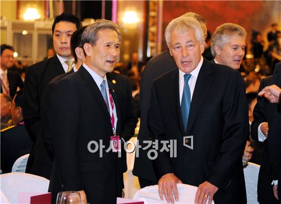 [아시아경제 양낙규 기자]김관진 국방부장관이 제12차 아시아 안보회의(샹그릴라 대화)에 참가해 각 국장관을 만나며 아ㆍ태지역 내 안보환경 개선과 사이버 위협 대응방안 등에 대한 논의를 이어가고 있다. 1일 국방부는 "김장관은 31일 몽골, 싱가포르 국방장관을 잇따라 만나 올해11월 개최되는 제2회 서울안보대화(SDD)에 참가해 달라고 요청했다"고 밝혔다. 김 장관은 이날 오후 싱가포르 샹그릴라호텔에서 다쉬뎀베렐 밧 에르딘 몽골 국방장관과 회담을 갖고 "아ㆍ태지역 차관급 인사를 모시고 역내 안보위협 해소 및 한반도 비핵화ㆍ평화체제 추진 전략을 모색하는 서울안보대화에 몽골 국방차관이 참석하기를 희망한다"고 밝혔다. 작년 11월 개최된 제1회 서울안보대화에는 아ㆍ태지역 16개국 차관급 국방관료와 민간 안보전문가들이 참석, 대량살상무기(WMD) 확산 대응ㆍ협력 방안과 사이버 위협의 실태와 대응방안 등을 논의했다. 올해 SDD는 11월 11일부터 사흘간 개최되며 아ㆍ태지역 내 안보환경 개선과 사이버 위협 대응방안 등에 대한 논의가 이루어질 예정이다. 국방부는 SDD의 참가국을 크게 확대해 아ㆍ태지역의 대표적인 다자안보 협의체 중 하나로 키운다는 목표를 갖고 있다. 양국 국방장관은 몽골군 현대화 지원을 위한 한국군 장비 이양 방안도 논의했다. 김 장관은 응 엔 헹 싱가포르 국방장관과의 회담에서도 "싱가포르가 올해 서울 SDD에 적극적으로 참가하면 역내 안보 위협 해소와 동북아 평화유지에 기여할 것으로 기대된다"며 SDD 참석을 요청했다.양국 국방장관은 함정 상호 방문 등 해군 간 협력 확대 방안도 논의했다. 이어 김 장관은 1일 척 헤이글 미국 국방장관과 회담을 갖고 대북 공조방안과 전시작전통제권 전환 등 양국 간 국방현안을 논의한다. 김 장관과 오바마 2기 미 행정부의 첫 국방장관인 헤이글 장관과의 만남(사진)은 이번이 처음이다. 김 장관은 31일 아시아 안보회의가 열리는 싱가포르 샹그릴라호텔에서 기자들을 만나 "우리나라 안보 문제에서 한미동맹 관계가 가장 중요하고 중심축"이라며 "동맹을 강화하는 방향으로 회담을 진행하겠다"고 밝혔다. 김민석 국방부 대변인은 "오늘 개최되는 한미 국방장관 회담에선 북한의위협을 평가하고 공조체제를 논의하며 한미동맹 강화방안 등을 논의한다"며 "특히 미 국방장관과는 처음 만나기 때문에 우의를 다지는 계기도 될 것"이라고 말했다. 한미 국방장관은 상견례를 겸한 이번 회담에서 2015년으로 예정된 전시작전통제권 등 한미 동맹현안에 대해서도 논의할 것으로 알려졌다.1일 오후에는 한ㆍ미ㆍ일 3국 국방장관 회담도 개최된다. 김 장관과 헤이글 장관, 오노데라 이쓰노리(小野寺五典) 일본 방위상이 참석한 가운데 열리는 3국 회담에서는 북한 핵과 미사일 위협을 평가하고 공조 방안을 논의할 예정이다. 김 장관은 샹그릴라 대화에 참가하기 위해 31일 오후 이틀간의 일정으로 싱가포르를 방문했다. 아시아안보회의는 영국 국제전략문제연구소(IISS) 주관 하에 2002년 이후 매년 개최되는 회의로, 아ㆍ태 및 유럽지역 27개국의 국방장관, 합참의장, 안보전문가 등이 참가한다.양낙규 기자 if@<ⓒ세계를 보는 창 경제를 보는 눈, 아시아경제(www.asiae.co.kr) 무단전재 배포금지>