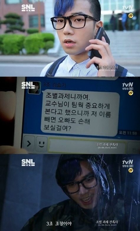 [아시아경제 온라인이슈팀] SNL 조별과제 잔혹사에 출연한 그룹 '엠블랙'의 지오가 시청자들로부터 큰 공감을 얻었다.지난 1일 방송된 tvN 'SNL코리아' 엠블랙 편에서 '조별과제 잔혹사' 코너에 출연한 지오는 대학교 시험 대체 과제로 조별과제를 맡은데 이어 조장까지 맡아 과제를 혼자 해결해야 했다.조원들인 이준과 김민교, 김슬기가 이런저런 핑계를 대며 과제를 서로 떠넘기고 소홀히 했기 때문이다. 조모임 날 김민교는 pc방에서 게임을 하며 예비군 훈련이라고 속였고 이준은 외할머니 제사. 김슬기는 클럽에서 춤을 추면서 몸이 안좋다고 지오를 속였다.이에 조원들의 거짓말을 알게 된 지오는 조원들을 찾아가 강의 교재로 한명씩 처리, 이후 혼자 조별과제 A+를 받아내 웃음을 자아냈다.방송을 본 네티즌들은 "내 속이 완전 다 시원하다", "저런 조원들 정말 짜증나", "현실에서도 저럴 수 있다면" 등의 반응을 보였다.온라인이슈팀 <ⓒ세계를 보는 창 경제를 보는 눈, 아시아경제(www.asiae.co.kr) 무단전재 배포금지>