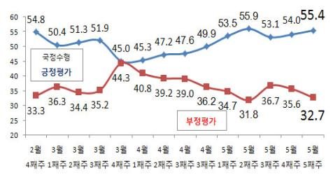 [아시아경제 이경호 기자]박근혜 대통령의 지지율이 2주 연속 상승했다. 3일 여론조사 전문기관 리얼미터(대표 이택수)의 5월 다섯째주 주간정례 여론조사 주간집계에서, 박근혜 대통령의 취임 14주차 대통령 국정수행 지지도는 1주일 전 대비 0.4%포인트 상승한 55.4%로 나타났다. 리얼미터는 "윤창중 사태 극복 및 정상외교와 대북긴장 완화 등에 힘입어 2주 연속 상승, 윤창중 파문 이전 수준으로 회복했다"고 평가했다. 국정수행을 잘못하고 있다는 응답은 32.7%로 2.1%포인트 하락했다.정당지지율에서는 새누리당이 1주일전 대비 2.0%포인트 상승한 45.6%, 민주당은 1.9%포인트 상승한 24.6%로 나타나, 양당 격차는 21.0%포인트로 나타났다. 이어서 통합진보당이 2.3%, 진보정의당이 2.0%의 지지율을 기록했고, 무당파는 2.9%포인트 하락한 22.9%로 나타났다.이번 주간집계는 5월 27일부터 5월 31일까지 5일간 전국 19세 이상 유권자 2500명을 대상으로 휴대전화와 유선전화 임의전화걸기(RDD) 자동응답 방식으로 조사했고 표본오차는 95% 신뢰수준에서 ± 2.0%포인트였다. 이경호 기자 gungho@<ⓒ세계를 보는 창 경제를 보는 눈, 아시아경제(www.asiae.co.kr) 무단전재 배포금지>