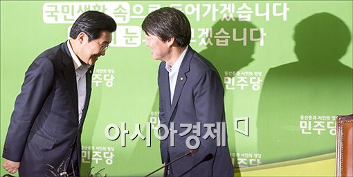 [아시아경제 윤동주 기자] 안철수(오른쪽) 의원이 4일 서울 여의도 국회에서 전병헌 민주당 원내대표를 만나 인사를 나누고 있다.윤동주 기자 doso7@<ⓒ세계를 보는 창 경제를 보는 눈, 아시아경제(www.asiae.co.kr) 무단전재 배포금지>