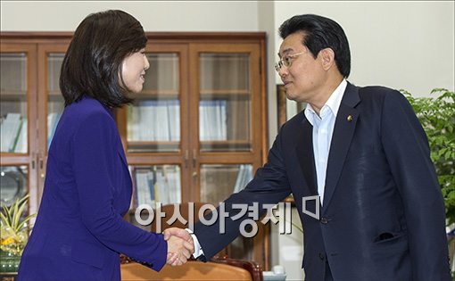 [아시아경제 윤동주 기자] 전병헌 민주당 원내대표가 4일 서울 여의도 국회에서 조윤선 여성가족부 장관을 만나 인사를 나누고 있다.윤동주 기자 doso7@<ⓒ세계를 보는 창 경제를 보는 눈, 아시아경제(www.asiae.co.kr) 무단전재 배포금지>