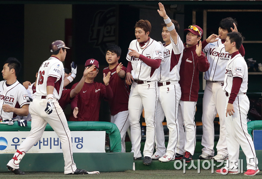 [아시아경제 정재훈 기자] 4일 오후 서울 목동야구장에서 열린 '2013 한국야쿠르트 세븐프로야구' 넥센 히어로즈와 삼성 라이온즈의 경기. 2회말 1사 무주자 상황 강정호가 좌익수 뒤 솔로홈런을 치고 동료들과 기쁨을 나누고 있다.정재훈 기자 roze@<ⓒ세계를 보는 창 경제를 보는 눈, 아시아경제(www.asiae.co.kr) 무단전재 배포금지>