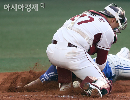 [아시아경제 정재훈 기자] 4일 오후 서울 목동야구장에서 열린 '2013 한국야쿠르트 세븐프로야구' 넥센 히어로즈와 삼성 라이온즈의 경기. 3회초 1사 2루 상황 정형식의 중견수 앞 안타 때 2루주자 이지영이 슬라이딩 홈인하고 있다.정재훈 기자 roze@<ⓒ세계를 보는 창 경제를 보는 눈, 아시아경제(www.asiae.co.kr) 무단전재 배포금지>
