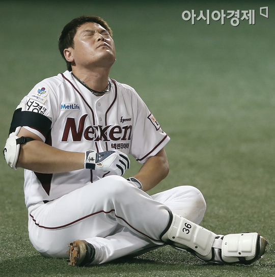 [아시아경제 정재훈 기자] 4일 오후 서울 목동야구장에서 열린 '2013 한국야쿠르트 세븐프로야구' 넥센 히어로즈와 삼성 라이온즈의 경기. 8회말 2사 무주자 상황 이성열이 심창민의 투구에 몸을 맞고 고통스러워하고 있다.정재훈 기자 roze@<ⓒ세계를 보는 창 경제를 보는 눈, 아시아경제(www.asiae.co.kr) 무단전재 배포금지>
