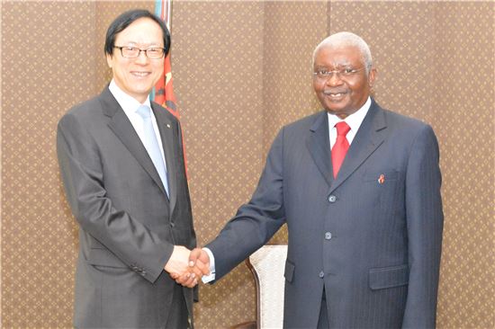 김용환 수출입은행장(왼쪽)과 아르만두 에밀리오 게부자 모잠비크 대통령(오른쪽)이 4일 서울 소공동 롯데호텔에서 만나 모잠비크의 대규모 인프라 건설지원과 한국기업의 투자 증진을 위한 금융협력에 대해 논의하고 기념촬영을 하고있다.