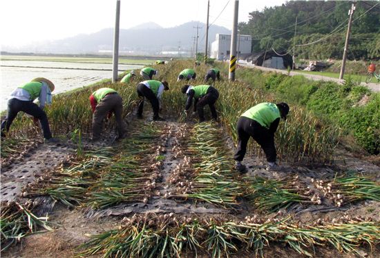 한국농어촌공사 영산강사업단(단장 안순섭) 직원 40여명은 5일 오전 7시부터 목포시 대양동 월산마을의 고령농 강영복씨의 마늘밭(3025㎡)에서 구슬땀을 흘렸다.강영복 할아버지는 “요즘 일손이 부족해 마늘을 어떻게 수확할 지 고민이었는데 직원들이 새벽부터 찾아와 이렇게 수확을 마무리할 수 있게 돼 한시름 놨다”고 고마움을 표했다.노상래 기자<ⓒ세계를 보는 창 경제를 보는 눈, 아시아경제(www.asiae.co.kr) 무단전재 배포금지>
