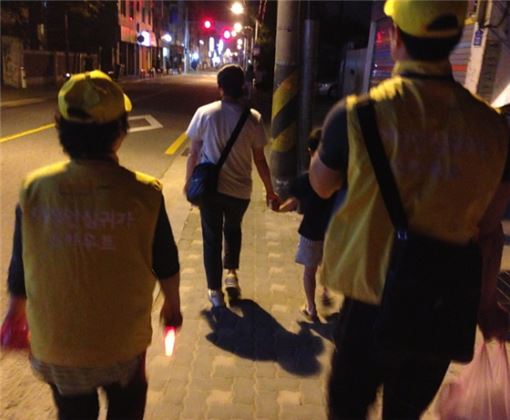 ▲ 서울시가 이번달부터 오는 11월까지 심야시간(밤 10시~새벽 1시) 여성들의 귀가를 동행 지원하는 '여성 안심귀가스카우트'를 운영한다. 사진은 지난 5일 밤 신청자 김주리(37, 마포구 합정동) 씨의 귀갓길을 두 명의 스카우트들이 동행하는 모습.