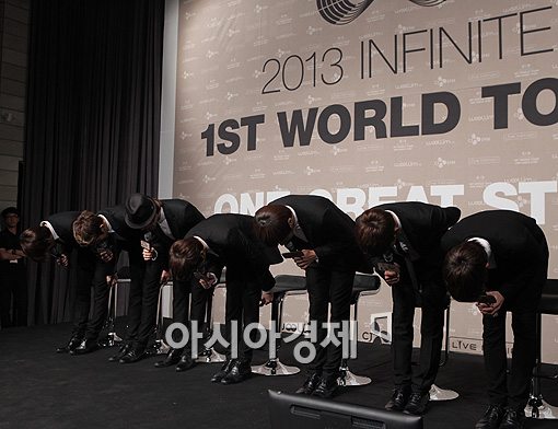 [아시아경제 정준영 기자] 그룹 인피니트가 10일 오후 서울 강남구 신사동 청담씨네시티 엠큐브에서 열린 '2013 인피니트 첫 월드 투어' 기자회견에 참석해 인사를 하고 있다.대규모 월드투어 콘서트 '원 그레이트 스텝(ONE GREAT STEP)'은 8월 서울을 시작으로 일본, 중국, 북미와 남미, 유럽에서 펼쳐진다.정준영 기자 jjy@<ⓒ아시아경제 & 스투닷컴(stoo.com)이 만드는 온오프라인 연예뉴스>