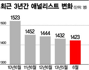 증시가 죽어가니…함께 묻히는 '순장(殉葬) 직업'연봉 동결해도 붙어있는게 감지덕지…'생계형 연구원'으로[아시아경제 이혜영 기자]증권사 애널리스트(연구원)들의 위상이 급전직하하고 있다. 글로벌 경제흐름을 분석하고 상장사들의 기업가치를 냉정하게 짚어내는 '전문가'로서의 입지가 심각하게 흔들리고 있다. 주식시장 장기침체로 증권사 수익성이 갈수록 악화되자 돈만 축내는 미운오리새끼 신세로 전락할 판이다. 구조조정 이야기가 나올 때마다 정리대상 '0순위'로 꼽힌다. 능력을 인정받고 거액에 스카우트되는 사례는 이제 전설로 치부된다. ◆좁아지는 입지, 늘어나는 한숨= 11일 금융투자협회에 따르면 이날 현재 국내외 증권사에 몸담고 있는 애널리스트는 총 1423명이다. 지난 2010년 6월 현재 1523명과 비교해 불과 3년 사이에 100개 자리가 없어졌다. 같은 기간 증권사 수가 늘었음을 감안하면 구조조정 폭은 더 컸던 셈이다.