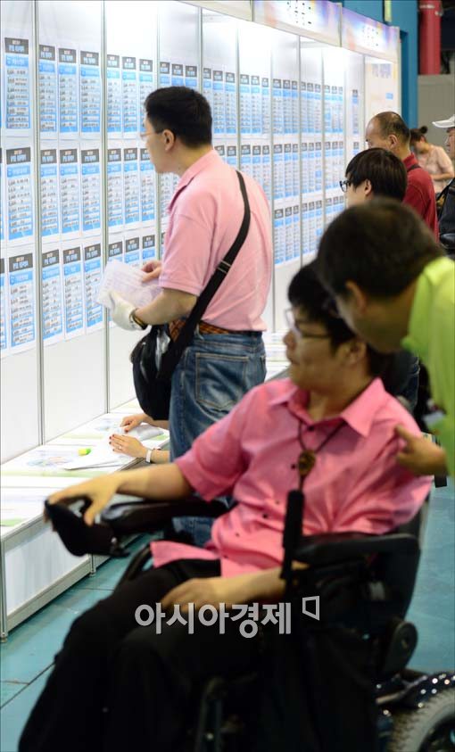 아시아경제 최우창 기자]11일 오후 서울 강남구 대치동 SETEC에서 열린 '2013 강남구 장애인 취업 박람회'를 찾은 장애인들이 취업공고 게시판을 둘러보고 있다. 최우창 기자 smicer@<ⓒ세계를 보는 창 경제를 보는 눈, 아시아경제(www.asiae.co.kr) 무단전재 배포금지>