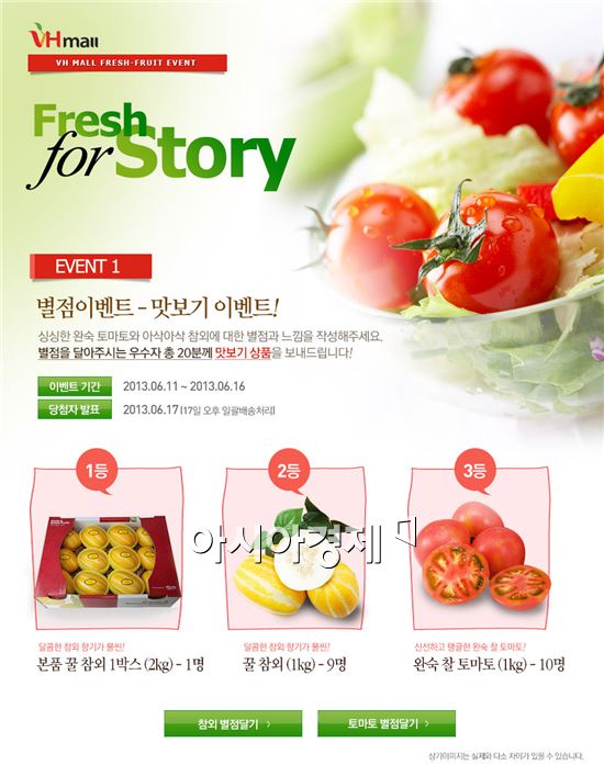 비타민하우스㈜(대표 김상국)가 만든 대한민국 건강 종합 쇼핑몰 VH몰에서 오는 16일까지 완숙 토마토와 아삭아삭 참외를 체험해볼 수 있는 ‘별점이벤트-맛보기이벤트’를 실시한다. 제철과일인 참외&토마토를 소비자가 미리 맛보고 구매할 수 있도록 한 이번 이벤트는 해당페이지에 싱싱한 완숙 토마토와 아삭아삭 참외를 보고 별점을 매기고 첫 느낌을 작성하면 된다. 또한 이벤트를 진행하는 11일~16일 사이에 참외 또는 토마토를 구매한 고객 중 선착순 10명을 추첨해 1kg를 추가 증정하는 1+1이벤트도 함께 진행될 예정이다.이번 ‘별점이벤트-맛보기이벤트’ 참여는 오는 16일까지 VH몰(//www.vhmall.co.kr)을 통해 11일부터 16일까지 응모 가능하며 당첨자는 17일 발표된다. 최종 선발된 우수자 1등 참외 1박스(2kg) 1명과 2등 참외(1kg) 9명, 3등 완숙 토마토(1kg) 10명 등 총 20명에게 각각 증정된다. VH몰 이벤트를 기획한 온라인팀 제갈은혜 대리/MD는 "이번 이벤트는 인터넷으로 신선식품을 구매할 때 맛과 신선도를 확인할 수 없어 번거로움을 느끼는 소비자들을 위해 준비됐다"고 밝히며 “앞으로 VH몰을 통해서 소개되는 신선식품들 또한 믿고 섭취할 수 있도록 품질관리와 이벤트를 준비하겠다“ 고 전했다.노해섭 기자 nogary@<ⓒ세계를 보는 창 경제를 보는 눈, 아시아경제(www.asiae.co.kr) 무단전재 배포금지>