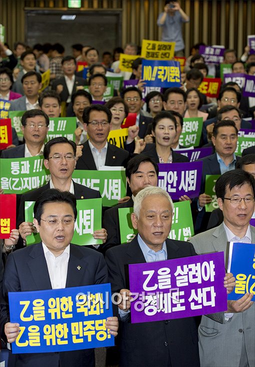 [아시아경제 윤동주 기자] 13일 서울 여의도 국회에서 열린 민주당 의원총회에서 전병헌(왼쪽) 원내대표, 김한길 대표, 신경민 최고위원등 의원들이 '을 지키기 및 국정원 국기문란'라고 적힌 종이를 들고 구호를 외치고 있다.윤동주 기자 doso7@<ⓒ세계를 보는 창 경제를 보는 눈, 아시아경제(www.asiae.co.kr) 무단전재 배포금지>