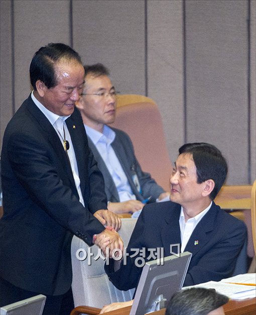 [아시아경제 윤동주 기자] 정갑윤(왼쪽) 새누리당 의원이 13일 서울 여의도 국회에서 열린 교육사회문화분야 대정부질문에서 진영 복지부 장관 자리로 찾아가 이야기를 나누고 있다.윤동주 기자 doso7@<ⓒ세계를 보는 창 경제를 보는 눈, 아시아경제(www.asiae.co.kr) 무단전재 배포금지>
