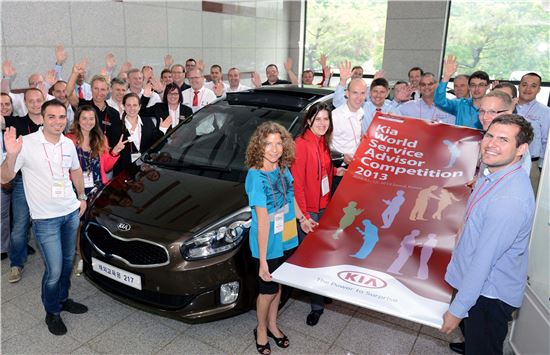 기아차 '제 2회 전세계 정비 상담원 경진대회' 참가자들이 다같이 기념사진을 촬영하고 있다.