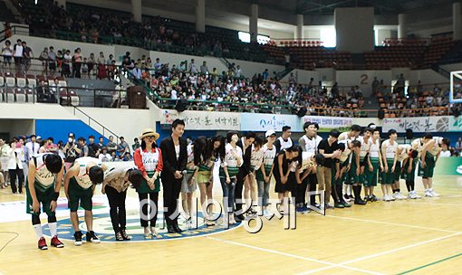'빠스껫 볼' 선수들이 15일 오후 경기도 의정부시 녹양동 의정부실내체육관에서 열린 '스타 연예인과 함께하는 희망농구 올스타 전 자선경기'에서 관객을 향해 인사를 하고 있다.이날 행사에는 케이블채널 tvN '빠스껫 볼(연출 곽정환)' 전 출연진과 대한민국 농구를 대표했던 올스타 농구선수들 이 참가해 대대적인 자선경기를 펼쳤다.'빠스껫 볼'은 일제강점기로부터 광복 이후 분단에 이르는 격동의 시대에 농구를 등불 삼아 어둠을 헤쳐나가는 청년 들의 사랑과 갈등, 화합과 감동적인 승리를 담은 드라마로 도지한, 이엘리야, 예은, 정승교, 정동현, 정인선, 공형진 , 김응수, 안석환, 이한위, 조희봉, 박순천, 지일주, 이민지 등이 출연한다. 오는 9월 방송 예정.정준영 기자 jjy@<ⓒ아시아경제 & 스투닷컴(stoo.com)이 만드는 온오프라인 연예뉴스>