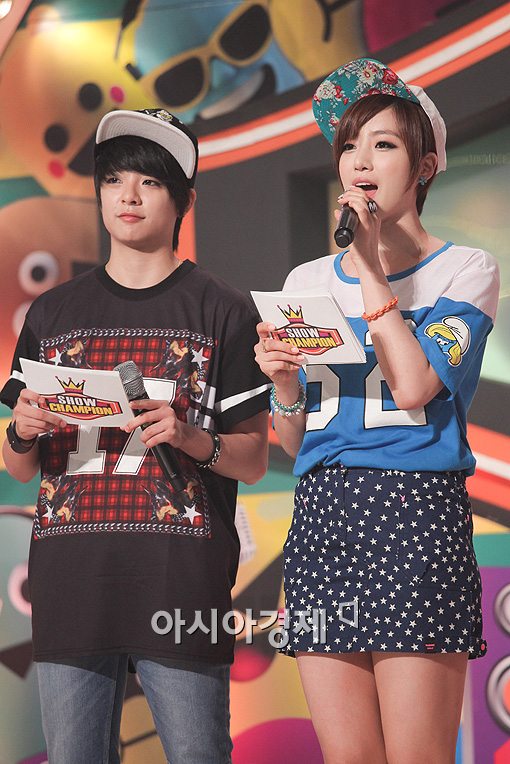 [아시아경제 정준영 기자] 걸 그룹 티아라 은정, 에프엑스 엠버가 19일 오후 서울 광진구 광장동 악스홀에서 열린 케이블 채널 MBC MUSIC '쇼 챔피언' 생방송에서 MC를 맡고 있다.정준영 기자 jjy@<ⓒ아시아경제 & 스투닷컴(stoo.com)이 만드는 온오프라인 연예뉴스>