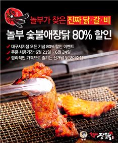[아시아경제 이은정 기자] ㈜놀부NBG(대표 김준영)의 닭갈비 브랜드 '숯불애장닭'이 쿠팡과 함께 29일까지 숯불닭갈비(매운맛+순한맛) 2인분을 80%할인된 가격인 2500원에 판매한다. 이번 할인행사는 대구 시지점과 광주 전남대점 신규 오픈을 기념해 마련된 것으로 지점 오픈일에 맞춰 기획됐다. 숯불애장닭 대구 시지점은 21일, 광주 전남대점은 24일 오픈한다. 소셜커머스 쿠팡에서 판매되는 숯불애장닭 대구·광주점 오픈 기념 80% 할인권을 통해 매운맛 닭갈비 1인분(6500원)과 순한맛 닭갈비 1인분(6000원) 2종을 2500원에 이용할 수 있다. 1인당 최대 2매까지 구매가능하며 테이블당 사용 제한은 없다. 대구 시지점 할인권은 20일부터 24일까지 5일간 판매되며 21일부터 24일까지 기간 내에 사용 가능하다. 광주 전남대점 할인권은 25일부터 29일까지 5일간 판매되며 26일부터 29일까지 기간 내에 사용 가능하다. 지점당 1000장씩 총 2000장 한정 판매로 진행된다. 권태우 ㈜놀부 미래전략마케팅팀장은 "숯불애장닭 지방 첫 직영점 오픈을 기념하여 숯불애장닭 인기메뉴를 커피한잔도 안 되는 가격에 맛볼 수 있는 파격 이벤트를 준비했다"고 말했다.이은정 기자 mybang21@<ⓒ세계를 보는 창 경제를 보는 눈, 아시아경제(www.asiae.co.kr) 무단전재 배포금지>