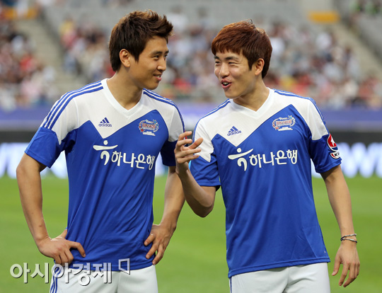 [아시아경제 정재훈 기자] 21일 오후 서울 서울월드컵경기장에서 열린 '하나은행 K리그 올스타전 2013'에 참가한 구자철과 윤석영이 대화를 나누고 있다.정재훈 기자 roze@<ⓒ세계를 보는 창 경제를 보는 눈, 아시아경제(www.asiae.co.kr) 무단전재 배포금지>
