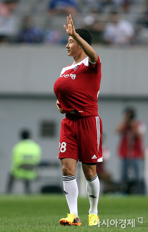 [아시아경제 정재훈 기자] 21일 오후 서울월드컵경기장에서 열린 '하나은행 K리그 올스타전 2013'에서 이동국의 첫 골이 터지자 이천수가 유니폼 안에 공을 넣고 출산 기념 세레모니를 펼치고 있다.정재훈 기자 roze@<ⓒ세계를 보는 창 경제를 보는 눈, 아시아경제(www.asiae.co.kr) 무단전재 배포금지>