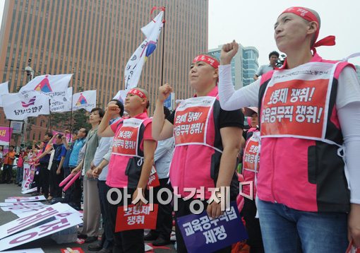 [아시아경제 백소아 기자] 22일 서울시 중구 서울역 광장에서 열린 '학교 비정규직 노동자대회'에서 전국 학교 비정규직 노조, 공공운수 노조, 학교비정규직본부, 전국 여성노조 등 학교 비정규직 노동자 1만 여명이 학교 비정규직 근로자들의 처우 개선을 촉구하는 구호를 외치고 있다. 이날 학교 비정규직 노동자들은 '호봉제 실시'와 '교육공무직 법제화'를 구호로 내걸고 정부에 대책 마련을 요구했다.백소아 기자 sharp2046@<ⓒ세계를 보는 창 경제를 보는 눈, 아시아경제(www.asiae.co.kr) 무단전재 배포금지>