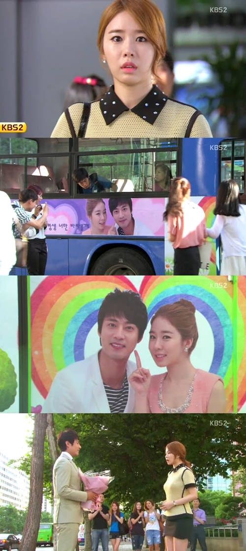 배우 고주원이 22일 밤 방송한 KBS2 주말드라마 '최고다 이순신'(극본 정유경, 연출 윤성식)에서 유인나에게 버스정류장에서 낭만적인 프러포즈를 했다.이날 방송에서 찬우(고주원 분)는 유신(유인나 분)에게 전화를 걸어 버스정류장에서 만나자는 약속을 했다. 이윽고 유신을 향한 사랑의 메시지가 담긴 버스가 도착해 그를 당황하게 만들었다. 뒤 이어 도착한 버스에는 두 사람이 손으로 하트를 크게 만들고 있는 모습 위에 '나랑 결혼해 줄래'라는 문구가 담겼다.유신이 놀란 사이 버스 뒷문이 열리고 꽃다발을 든 찬우가 등장했다. 얼굴에 미소를 띄운 그는 "이유신, 나랑 결혼해 줄래?"라며 낭만적 프러포즈를 했다.유신이 망설이는 동안 주변 행인들이 "받아줘"라고 외쳤고, 이내 유신은 꽃다발을 받으며 수줍게 미소 지어 보는 이들을 부럽게 만들었다.이렇듯 찬우의 프러포즈가 성공한 가운데 향후 이들의 로맨스가 어떻게 전개될지 기대가 모아졌다.이금준 기자 music@<ⓒ아시아경제 & 스투닷컴(stoo.com)이 만드는 온오프라인 연예뉴스>