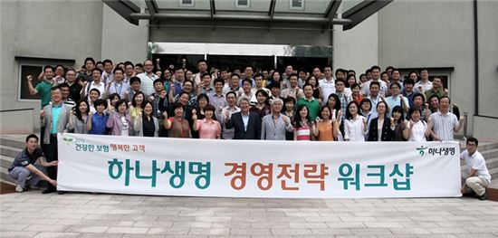 [아시아경제 김현정 기자] 하나생명 임직원들이 지난 22일 상반기 중간관리자 경영혁신 워크샵이 개최된 경기도 용인 하나빌 연수원 앞에서 기념촬영을 하고있다. 김태오 하나생명 대표와 전 부서별 과장급 이상 임직원 총 100여명이 참석한 이번 워크샵에서 하나생명은 손익 증대와 비용절감 등 미래가치 창출을 위한 토론의 장을 마련했다. 김현정 기자 alphag@<ⓒ세계를 보는 창 경제를 보는 눈, 아시아경제(www.asiae.co.kr) 무단전재 배포금지>