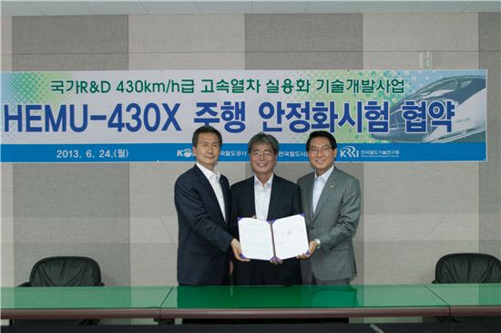 [아시아경제 박미주 기자]한국철도공사(코레일)가 24일 한국철도기술연구원, 한국철도시설공단과 '차세대 고속철도 기술개발사업 개발차량 시운전시험에 대한 협약서'를 체결하고 본격적인 시운전에 착수한다고 밝혔다.차세대 고속열차 '해무(HEMU-430X)' 실용화를 위한 주행거리 10만㎞ 이상 제반거리 확보를 위해서다.이날 협약식에는 임영록 한국철도시설공단 연구원장, 김영학 한국철도기술연구원 수석연구원, 엄승호 코레일 연구원장 등이 참석했다.박미주 기자 beyond@<ⓒ세계를 보는 창 경제를 보는 눈, 아시아경제(www.asiae.co.kr) 무단전재 배포금지>