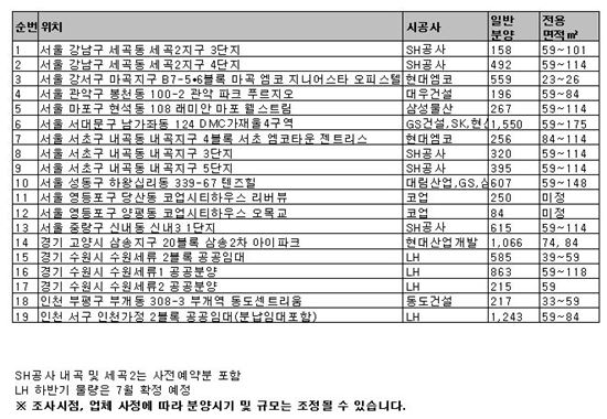 수도권 7월 일반분양 예정 단지 (자료제공 : 부동산써브)