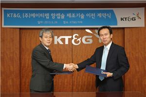 김영택 에이티랩 사장(오른쪽)과 이영택 KT&G R&D본부장이 기술이전 계약을 체결한 후 악수를 나누고 있다.<br /> <br />