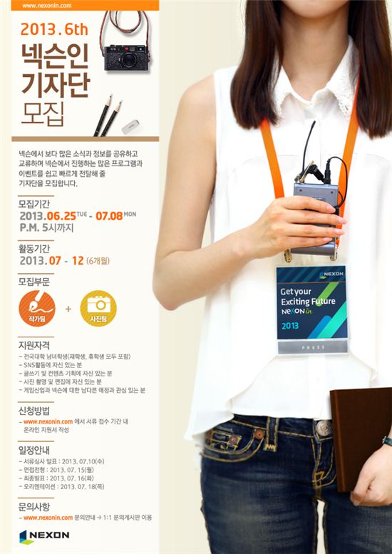 [아시아경제 이승우 기자] 게임사 넥슨(대표 서민)이 대학생 기자단 `넥슨인 기자단` 6기 참가자를 모집한다. 모집부문은 사진팀과 작가팀으로 구분된다. 전국 대학생과 휴학생은 누구나 지원할 수 있다. 내달 8일 오후 5시까지 넥슨인 홈페이지(www.nexonin.co.kr)에서 지원서를 접수 받고, 서류전형과 면접을 거쳐 최종 기자단 10명을 선발한다. 선발된 기자단은 6개월간 넥슨인 홈페이지와 넥슨인 블로그(nxreporter.nexon.com)에 넥슨 컴퍼니의 다양한 소식과 이벤트 등을 전하게 된다. 넥슨의 사내 행사와 이벤트, 채용, 사회공헌, 넥슨 포럼은 물론 넥슨인 홈페이지에서 진행되는 대학생 프로그램에도 참여할 수 있다. 이밖에도 평소 만나고 싶었던 넥슨 컴퍼니의 개발자들과 인터뷰를 진행하며 게임 산업에 대한 이해를 높일 수 있다. 기자단 활동 종료 후에는 활동평가를 바탕으로 우수 기자를 선정해 뉴아이패드, 넥서스 7 등을 지급한다. 또한 기자단 전원은 입상여부와 관계없이 향후 넥슨 컴퍼니 인턴십과 공개 채용 지원시 가산점을 받는다. 넥슨 권도영 인재개발팀장은 "취재지원뿐만 아니라 기자단만을 위한 직무교육 등 다양한 프로그램도 준비하고 있다"며 "넥슨과 게임산업에 애정을 가진 대학생들의 많은 지원을 바란다"고 밝혔다.이승우 기자 press011@<ⓒ아시아경제 & 스투닷컴(stoo.com)이 만드는 온오프라인 연예뉴스>