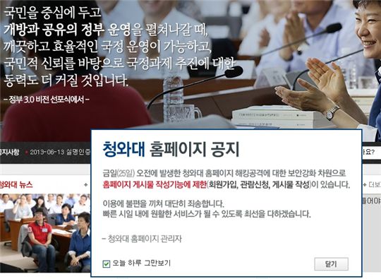 [아시아경제 박충훈 기자] 25일 오전 정체불명의 해커에게 공격당해 운영이 중단됐던 청와대 홈페이지가 복구됐다.청와대 관계자는 25일 "해킹 당했던 홈페이지가 게시판 글쓰기 등 일부 기능을 제한한 채 다시 복구됐다"고 밝혔다.현재 청와대 홈페이지에는 "금일(25일) 오전에 발생한 청와대 홈페이지 해킹공격에 대한 보안강화 차원으로 홈페이지 게시물 작성기능에 제한(회원가입, 관람신청, 게시물 작성)이 있다"는 팝업 공지사항이 올라와 있다.이번 청와대 사이트의 폐쇄는 국제적인 해커집단 어나니머스(anonymous)의 소행으로 추정됐으나 어나니머스측은 "우리가 한 게 아니다"라며 부인하고 있다. 청와대 홈페이지는 25일 오전 9시 30분 경 정체불명의 해커에게 해킹 당했으며 "통일대통령 김정은장군님 만세!, 우리의 요구조건이 실현될때까지 공격은 계속 될 것이다"라는 메시지가 대문에 걸렸다. "우리를 기다리라.우리를 맞이하라. 민주와 통일을 지향하는 #어나니머스코리아"라는 등 어나니머스임을 주장하는 문구도 함께 게재됐다. 청와대 외에 국무조정실, 총리비서실 등 주요 정부 기관 홈페이지도 정체불명의 해커들에게 공격을 받아 마비됐다.그러나 자신을 어나니머스의 일원이라고 주장하는 한 트위터리안(@Anonsj)은 25일 오전 11시5분과 오후 2시 20분, 두 차례에 걸쳐 "우리는 '청와대'를 해킹한 적이 없다"는 입장을 밝혔다.Anonsj는 "북한이 당신들이 한것처럼 조작한 것이냐? 아니면 당신들이 정말로 해킹한 것이냐"는 네티즌 질문에 "조작입니다"라고 답변했다. 어나니머스가 공개한 공격 사이트 명단에도 국내 사이트는 포함되지 않았다.한편 잇따른 정부 사이트 공격에 합동참모본부와 국가정보원은 오전 10시45분께 정보작전방호태세 '인포콘'을 평시 단계인 '5'에서 준비태세 단계인 '4'로 한 단계 격상하고 사이버 보안 강화에 나섰다.박충훈 기자 parkjovi@<ⓒ세계를 보는 창 경제를 보는 눈, 아시아경제(www.asiae.co.kr) 무단전재 배포금지>