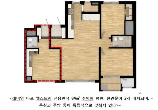 [아시아경제 김창익 기자]‘주거와 임대를 동시에’삼성물산이 래미안 최초로 ‘수익형 평면’을 선보인다. 삼성물산은 이달중 서울 마포구 현석 2구역에 공급하는 ‘래미안 마포 웰스트림’ 아파트 일부 주택형에 ‘수익형 평면’을 적용한다. 수익형 평면이란 아파트 한 채에 별도의 현관을 두고 1~2인이 살기에 적합한 공간을 마련, 전세나 월세를 놓을 수 있게 한 평면이다. 작가 등 프리랜서 직업을 가진 경우면 사무실로도 활용할 수 있다. 등기상 한 채지만 사실상 두 가구다. 전용 84㎡ 아파트에 세대 분리형 평면이 적용되는 건 드문 예다. 삼성물산 김윤만 분양소장은 “주변에 홍익대, 이화여대, 연세대 등 많은 대학과 광화문, 여의도 등 업무시설이 많아 임차수요가 풍부한 편"이라고 말했다. 래미안 마포 웰스트림은 지하 3~지상 최고 35층 8개동 총 773가구 규모다. 이중 수익형 평면은 84㎡E 타입 62가구로 32가구가 일반에 분양된다. 김창익 기자 window@<ⓒ세계를 보는 창 경제를 보는 눈, 아시아경제(www.asiae.co.kr) 무단전재 배포금지>