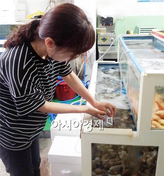 강진군보건소 직원이 비브리오패혈증균 검출여부를 검사하기위해 어패류를 취급하는 음식업소들을 방문해 수족관 물을 채수하고 있다.
