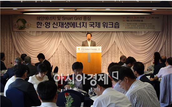 한영 신재생에너지 워크숍이 배용태 전남도 행정부지사와 고석규 목포대 총장, 최민선 목포해양대 총장, 영국 콘웰주 대학교수, 에너지분야 전문가 등 150여명이 참석해 26일 목포 샹그리아호텔에서 열렸다. 해양에너지, 풍력, 태양광, 스마트그리드 등 신·재생에너지 분야에 대한 주제발표와 토론 순으로 진행됐다. 사진제공=전남도노해섭 기자 nogary@<ⓒ세계를 보는 창 경제를 보는 눈, 아시아경제(www.asiae.co.kr) 무단전재 배포금지>