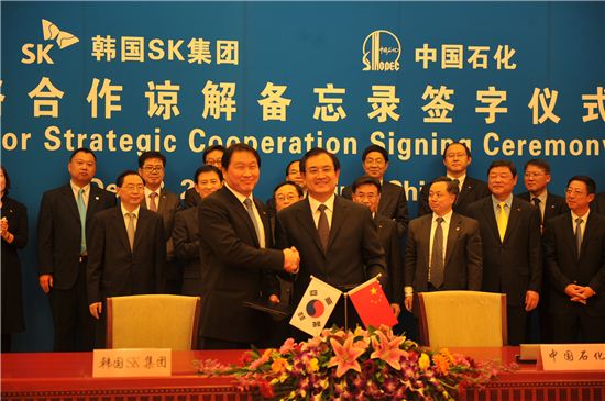 최태원 SK(주) 회장(사진 앞줄 왼쪽)과 왕티엔푸(王天普) 시노펙 총경리가 2011년 12월 베이징에서 본격적인 사업확대를 위한 포괄적 MOU를 체결한 뒤 악수를 나누고 있는 모습.