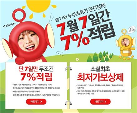 [아시아경제 이정민 기자]소셜커머스 위메프(대표 박은상·허민)가 1일부터 8일까지 일주일간 7% 포인트 적립을 시행한다.사측에 따르면 7월을 맞아 고객의 성원에 보답하고자 ‘7월 7일간 7% 적립’이라는 이른바 7·7·7 이벤트를 실시하게 됐다.위메프는 지난 1월부터 전체 배송상품에 대해 최저 5%에서 최대 10%까지 적립을 시행하며 5% 적립 실시 전 월 매출액 400억원 규모에서 5월 매출액 730억원을 돌파, 83%의 매출신장률을 기록한 바 있다. 금일부터 8일 9시 59분까지 전체 배송상품 7% 적립을 실시하며 8일 10시부터는 종전대로 5% 적립을 유지한다. 여행 카테고리의 경우 해외여행에서만 3% 적립을 시행해오던 것을 제주도, 입장권·레저, 호텔, 리조트, 펜션·리조트까지 그 범위를 확장했다. 여행 상품의 3% 적립은 오는 16일 10시까지 실시된다.이정민 기자 ljm1011@<ⓒ세계를 보는 창 경제를 보는 눈, 아시아경제(www.asiae.co.kr) 무단전재 배포금지>