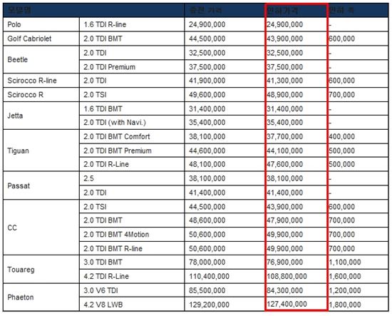 [아시아경제 임철영 기자]폭스바겐코리아가 1일부터 적용되는 한-EU 자유무역협정(FTA) 3차 관세 인하에 따른 유럽산 모델의 새로운 가격을 확정했다. 대상은 신형 골프, 골프 카브리올레, 시로코 R 및 R-Line, 티구안, CC, 투아렉, 페이톤 등 유럽에서 생산된 7개 차종 16개 모델이다. 플래그십 세단 페이톤 4.2 V8 LWB는 종전 가격 1억2920만원에서 180만원이 인하된 1억2740만원으로 조정되며, 수입 SUV 중 유일하게 수입차 베스트셀링 Top10에 꾸준히 오르며 높은 인기를 얻고 있는 티구안의 경우 최대 50만원(프리미엄/R-Line) 인하된다. 지난 4월 말 첫 선보인 폴로는 FTA 관세 인하 혜택이 출시시점부터 이미 적용된 가격이며, 오는 2일 사전 판매 개시를 앞둔 신형 골프의 경우 추후 가격이 공개될 예정이다. 더불어 폭스바겐 CC 2.0 TDI BMT R-line은 70만원, 시로코 R 2.0 TSI도 70만원 가격이 인하된다. 유럽 외 지역에서 생산되는 제타, 더 비틀 및 파사트 등은 기존과 동일한 가격을 유지한다.임철영 기자 cylim@<ⓒ세계를 보는 창 경제를 보는 눈, 아시아경제(www.asiae.co.kr) 무단전재 배포금지>