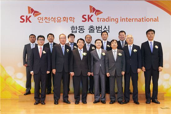 SK인천석유화학, SK트레이딩인터내셔널 합동 출범식 후 참석자들이 기념촬영을 하고 있는 모습. 사진 왼쪽부터 권순범 SK인천석유화학 노조위원장, 김형건 SK트레이딩인터내셔널 사장, 최관호 SK루브리컨츠 사장, 이재환 사외이사, 김영주 사외이사, 김창근 SK 수펙스추구위원회 의장, 최혁 사외이사, 구자영 SK이노베이션 부회장, 차화엽 SK종합화학 사장, 최명해 사외이사, 김기용 SK에너지 노조위원장, 이훈규 사외이사, 박봉균 SK에너지 및 SK인천석유화학 사장.