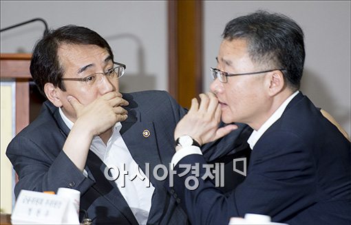 [아시아경제 윤동주 기자] 1일 서울 여의도 수출입은행에서 열린 재정관리협의회에 참석한 이석준(왼쪽) 기획재정부 2차관이 정찬우 금융위원회 부위원장과 회의 시작 전 의견을 나누고 있다.윤동주 기자 doso7@<ⓒ세계를 보는 창 경제를 보는 눈, 아시아경제(www.asiae.co.kr) 무단전재 배포금지>