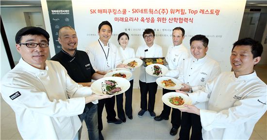 SK해피쿠킹스쿨이 SK네트웍스 워커힐, 전문 레스토랑과 업무협약식을 체결하고 기념촬영을 하고 있는 모습. 사진 왼쪽부터 박찬일 쉐프(인스턴트펑크), 서문용욱 쉐프(르꽁뜨와), 백상준 쉐프(컬리나리아12538), 김은희 쉐프(더그린테이블), 박정석 쉐프(오늘), 지오바니 마우로 세우 쉐프(SK네트웤스㈜워커힐), 하영철 조리팀장(SK네트웍스㈜ 워커힐), 어윤권 쉐프(구르메에오).