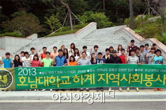 호남대학교 사회봉사센터(센터장 조규정)는 2일 ‘2013 호남대학교 하계 지역사회봉사활동’ 발대식을 갖고 전남 장흥군 장평면 임리를 방문해 3박4일동안 봉사활동에 들어갔다. 호남대학교 학생과 교수 등 60여명이 참여한 이번 하계봉사에서는 재가 복지팀, 취사 봉사팀, 벽화봉사팀, 이미용 봉사팀, 장수사진촬영팀 등 7개팀이 다양한 전공분야를 살려 농촌 지역사회봉사 프로그램을 진행하게 된다. 또 한국가스공사 호남지사 협력으로 LPG가스 점검 및 시설 보수도 진행된다. 호남대 사회봉사센터는 이번 봉사활동에서 농어촌지역주민들에게 생활밀착형 문화, 복지 서비스를 제공하며 고령화 사회의 맞춤형 서비스 통해 지역사회봉사의 의미를 고취함은 물론, 대학이 지역 사회와 더불어서 함께 공존하고 나아가는 좋은 계기를 만들어 갈 예정이다. 노해섭 기자 nogary@<ⓒ세계를 보는 창 경제를 보는 눈, 아시아경제(www.asiae.co.kr) 무단전재 배포금지>