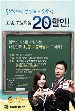 [아시아경제 오주연 기자]블랙스미스는 다음달 31일까지 전국의 초·중·고등학생을 대상으로 청소년 할인 이벤트를 진행한다고 3일 밝혔다.이번 이벤트는 1인 1메뉴 주문 시 중·고등학교 학생증 지참 고객에 한해 메인 메뉴 가격의 20%를 할인해주고 초등학생은 키즈메뉴를 제외한 메인 메뉴 주문 시 20% 할인이 적용되는 가격 혜택 프로모션이다.방학을 맞이한 청소년들에게 가격 혜택을 제공해 학생들이 친구들, 가족들과 함께 보다 쉽게 정통 이탈리안 요리를 즐길 수 있도록 하기 위해 기획됐다.이와 더불어 블랙스미스는 오전 11시부터 밤 10시까지 ‘샐러드 바’를 운영, 메인 메뉴를 1개만 주문해도 다양하고 신선한 재료의 건강한 샐러드를 무료로 즐길 수 있도록 제공하고 있다. 이벤트 기간 청소년들이 블랙스미스를 방문하면 가격할인과 더불어 샐러드바까지 무료로 이용할 수 있어 실질적인 혜택은 더욱 클 것으로 보인다.블랙스미스 관계자는 "방학을 맞아 청소년 할인 요금을 도입함으로써 학생들의 큰 호응을 얻을 것으로 기대하고 있다"며 "앞으로도 다양한 연령층 고객들이 보다 쉽게 블랙스미스를 즐길 수 있도록 새로운 서비스와 풍성한 고객 혜택 프로모션을 펼쳐나갈 계획"이라고 전했다. 오주연 기자 moon170@<ⓒ세계를 보는 창 경제를 보는 눈, 아시아경제(www.asiae.co.kr) 무단전재 배포금지>