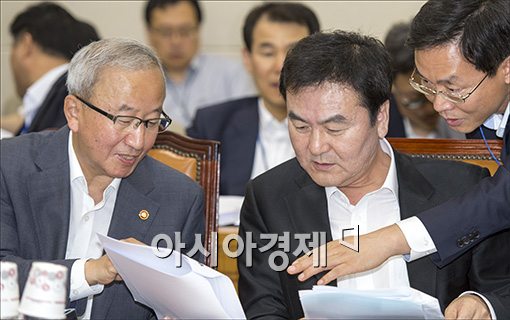 [아시아경제 윤동주 기자] 3일 서울 여의도 국회에서 열린 가계부채청문회에 출석한 현오석(왼쪽) 경제부총리 겸 기획재정부 장관이 신제윤(가운데) 금융위원장과 자료를 보며 의견을 나누고 있다. 이번 청문회에는 현 부총리를 비롯해 서승환 국토교통부 장관, 신제윤 금융위원장, 김중수 한국은행 총재, 이종휘 신용회복위원장, 장영철 한국자산관리공사 사장, 서종대 한국주택금융공사 사장 등이 증인으로 출석했다.윤동주 기자 doso7@<ⓒ세계를 보는 창 경제를 보는 눈, 아시아경제(www.asiae.co.kr) 무단전재 배포금지>