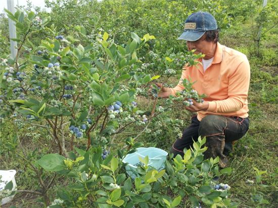 미국과 일본에서 유기 인증을 받은 김성욱씨가 블루베리를 수확하고 있다.