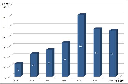 연도별(2006~2012년) 컴퓨터서버 가상화기술특허 출원건수 비교그래프